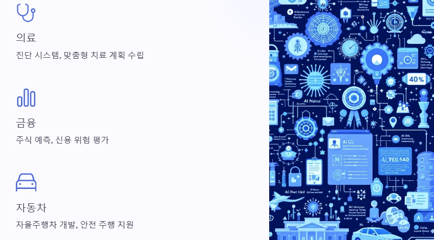 AI는 의료 분야에서 진단 시스템을 개선하고 환자에게 맞춤형 치료 계획을 수립하는 데 활용됩니다. 예를 들어, 암 진단을 위한 이미지 분석, 유전체 데이터 분석을 통한 질병 예측 등에 활용됩니다.