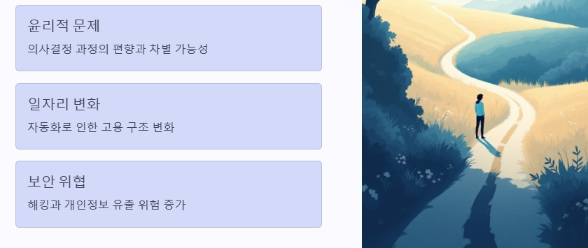 가장 우려되는 부분 중 하나는 윤리적 문제입니다. AI가 의사결정 과정에 개입하게 되면, 그 과정에서 생길 수 있는 편향이나 차별 문제가 발생할 수 있습니다. 예를 들어, AI 시스템이 특정 집단에 대한 차별적인 결정을 내릴 경우, 이는 사회적 불평등을 심화시킬 수 있습니다. 또한, 일자리 문제도 큰 이슈입니다. 많은 전문가들은 AI가 자동화를 통해 일자리를 대체할 가능성이 높다고 경고하고 있습니다. 이는 노동 시장의 구조를 변화시키고, 고용 불안을 초래할 수 있습니다.