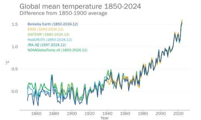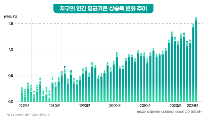 지구의 평균 온도는 지난 수십 년간 지속적으로 상승해 왔습니다. 특히 2010년대 이후로 그 상승폭이 더욱 두드러지게 나타났습니다. 아래의 그래프는 온도 변화를 보여주고 있으며, 최근 몇 년간의 급격한 온도 상승을 확인할 수 있습니다. 이러한 변화는 단순한 자연 현상이 아니라 인간의 활동과 밀접한 관련이 있습니다.